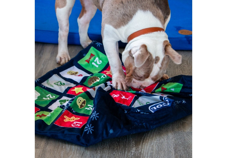 Large, crinkly advent calendar themed dog toy, with hidden pockets to add treats for extra enrichment