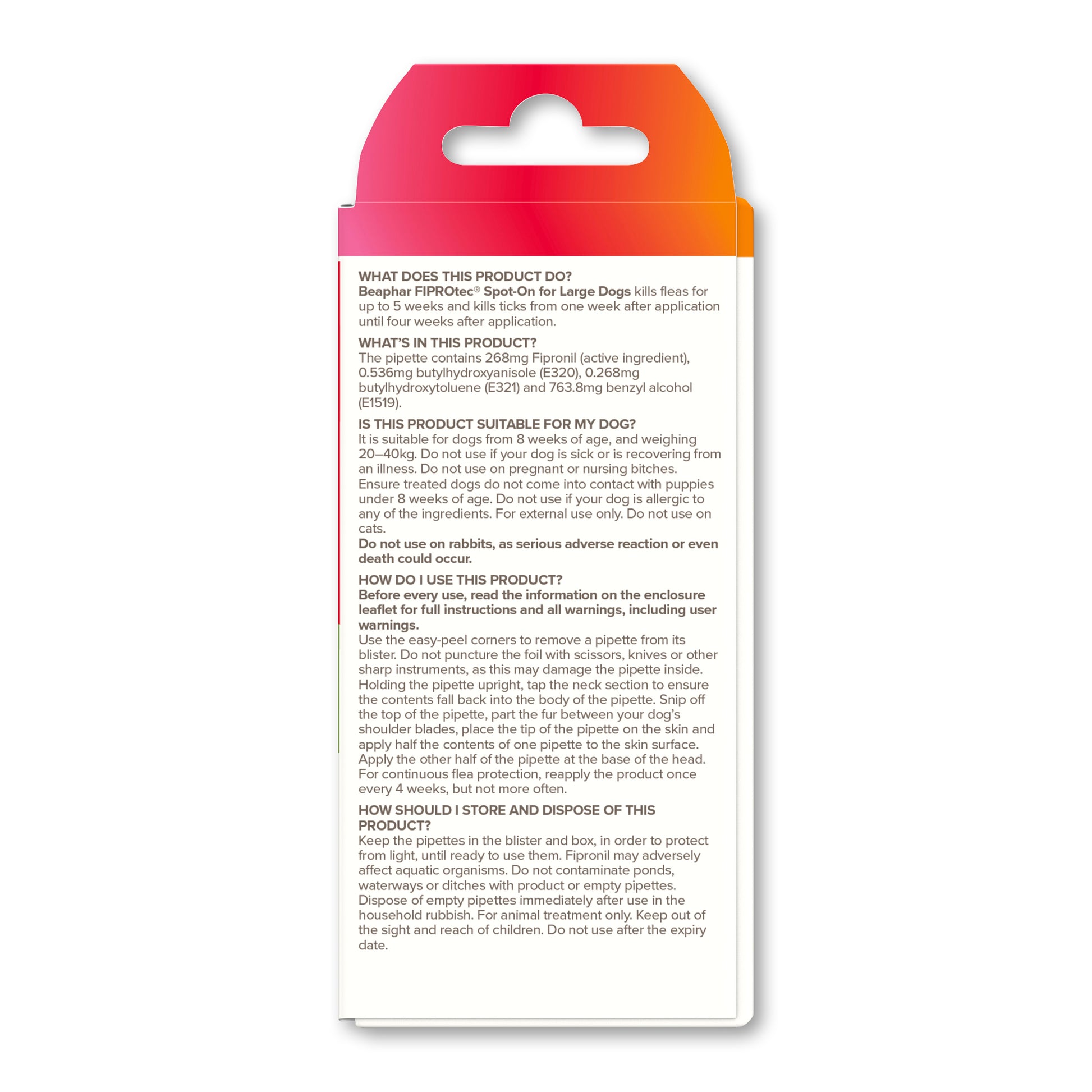 Beaphar FIPROtec® Spot-On for Large Dogs is an effective and affordable veterinary strength medicine to control fleas and ticks on your dog. Containing the well-known active ingredient fipronil, Beaphar FIPROtec® Spot-On for Large Dogs effectively kills fleas for up to five weeks and kills ticks for up to four weeks.
