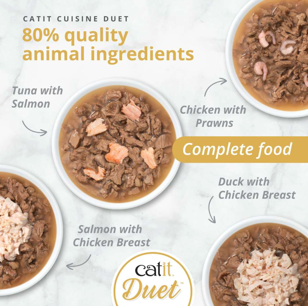 The Catit Cuisine Duet Variety Pack serves up a delicious rotation of tender Catit Bites topped with quality meat or seafood. Enjoy the universal appeal of contrasting textures and flavours in every recipe. Made with 80% quality animal ingredients and enriched with taurine and essential vitamins, it’s a grain‑free complete meal cats can savour day after day. Why cats love it: