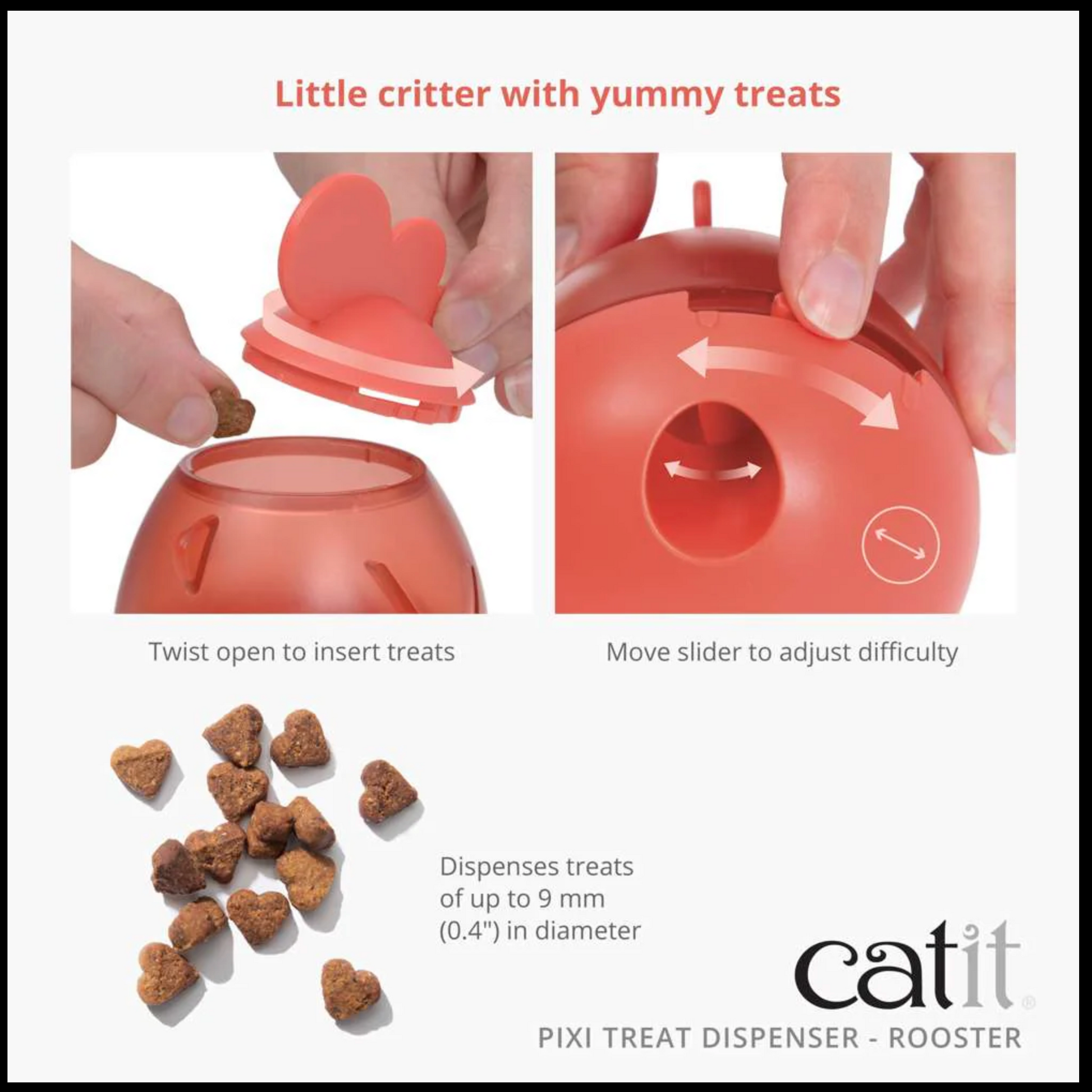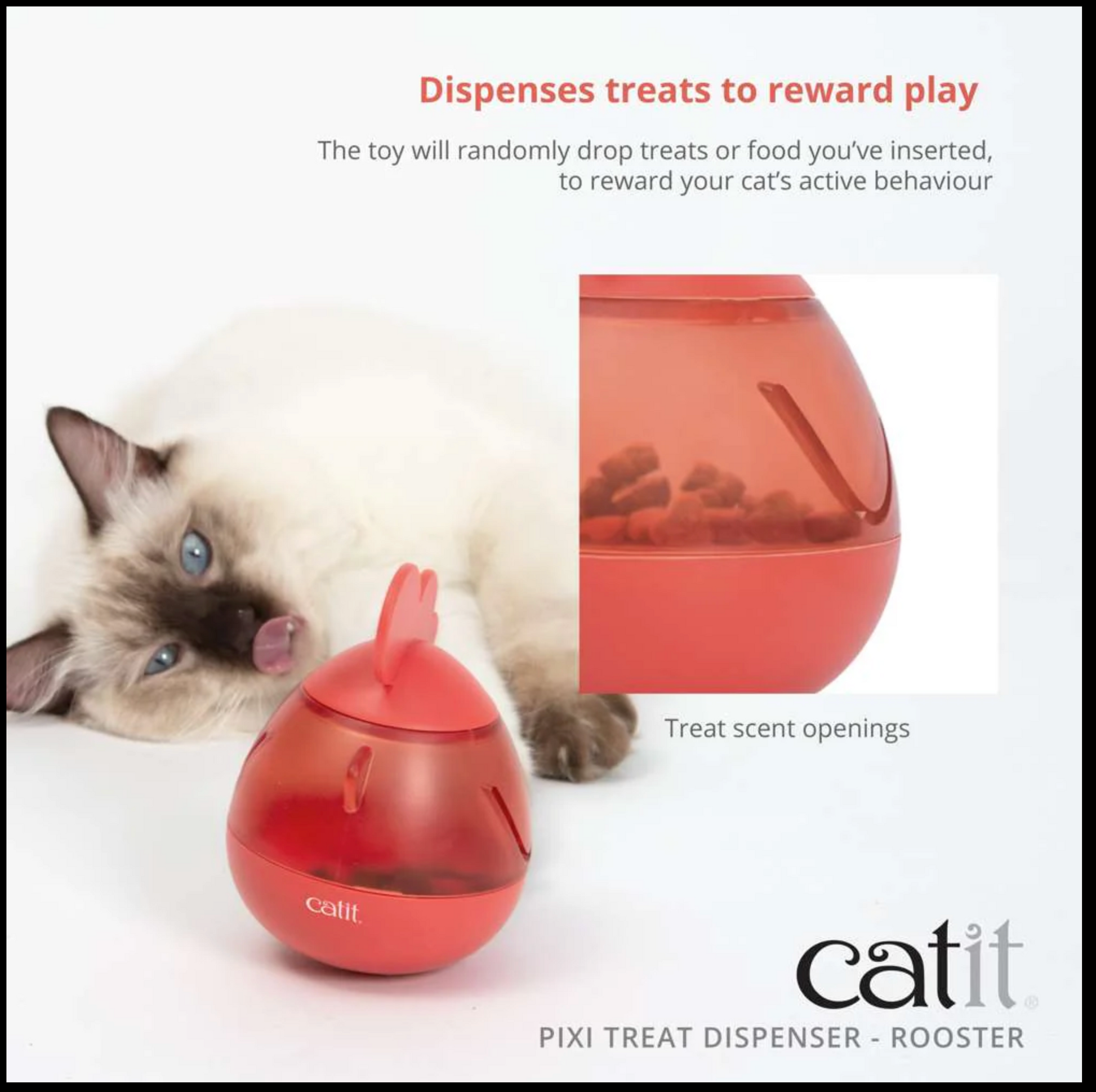 Play, pounce, and snack! This treat dispensing rooster toy wobbles and rolls as your cat bats it around, releasing tasty treats for hours of fun. Keep your cat entertained, active, and rewarded with this adorable, wobbling toy which turns playtime into a tasty challenge! The weighted base keeps the toy upright for endless swatting fun, while the adjustable opening lets you control treat flow and difficulty. It’s perfect for encouraging your cat’s natural hunting instincts and slowing down treat time. Compatible with most dry food or treats up to 9mm in diameter, this treat-dispensing toy keeps your cat stimulated both mentally and physically.