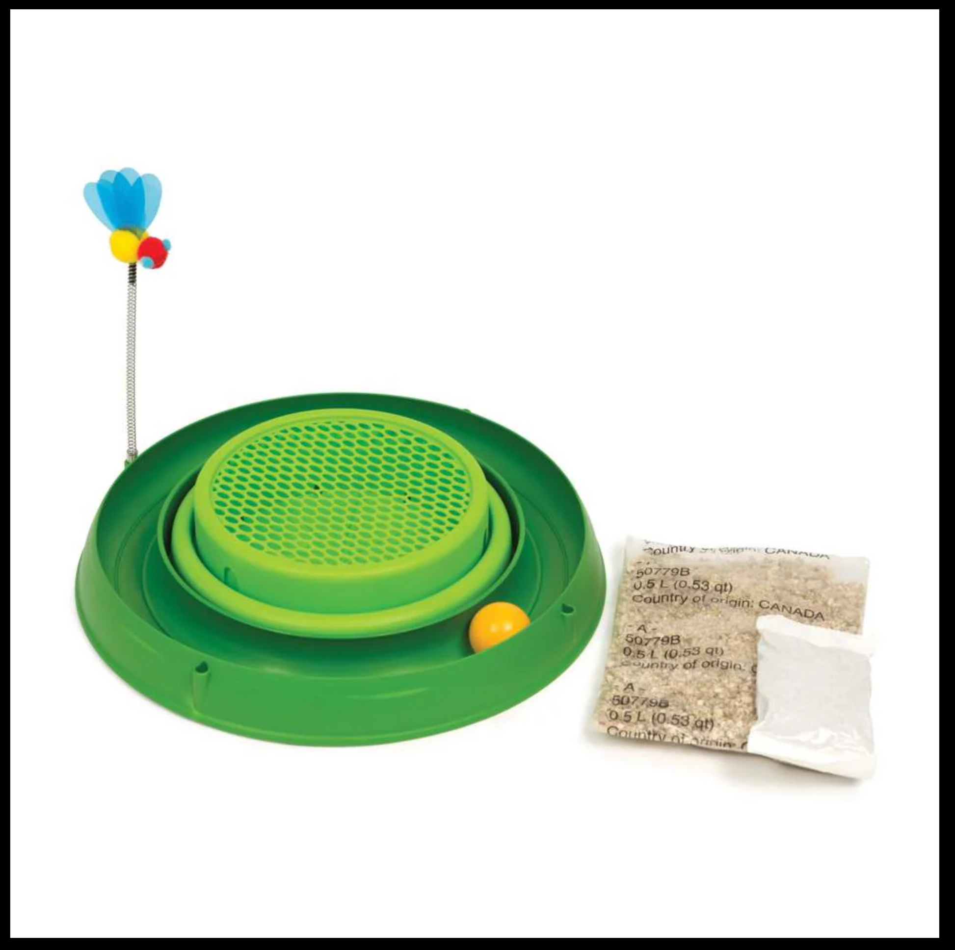 Play, chase, and graze — all in one toy. This Play Circuit Ball Toy with Grass Planter keeps your cat active and engaged while supporting their natural instincts to hunt, play, and nibble on fresh greens. Keep your cat active, curious, and entertained with this 3-in-1 activity centre combining play, stimulation, and wellbeing in one clever design. Cats can chase the rolling ball through the enclosed track, pounce on the bouncy bee teaser, and nibble on fresh cat grass grown in the built-in planter for a healthy treat. The included catnip adds an extra layer of excitement, keeping even the most playful cats engaged for hours. This interactive toy encourages both mental and physical activity, supports digestion through natural grazing, and offers a safe, healthy alternative to houseplants.