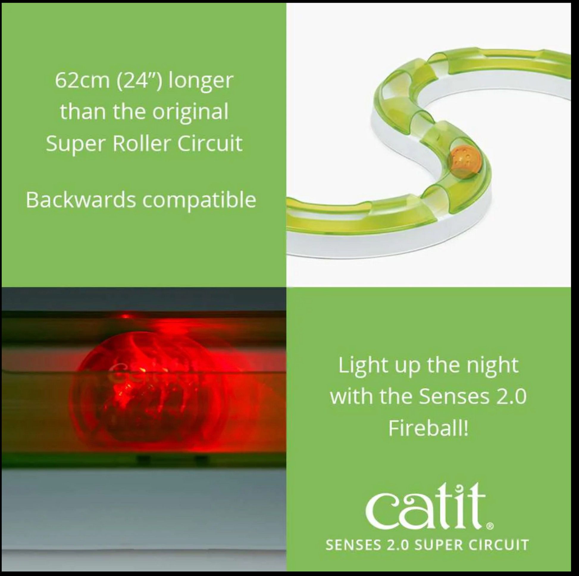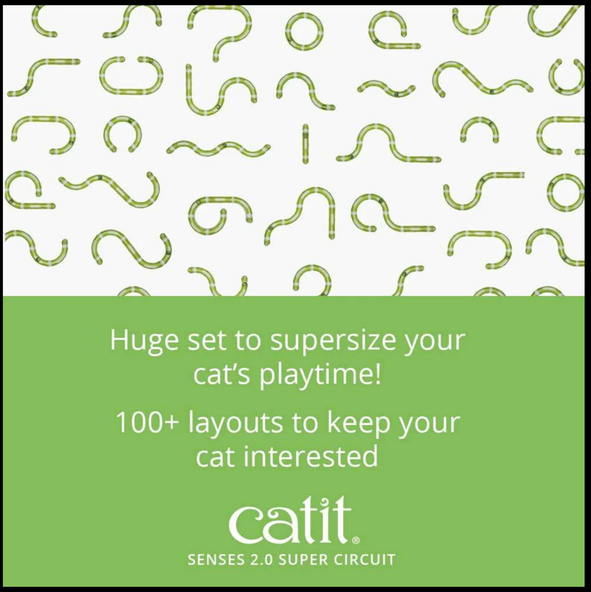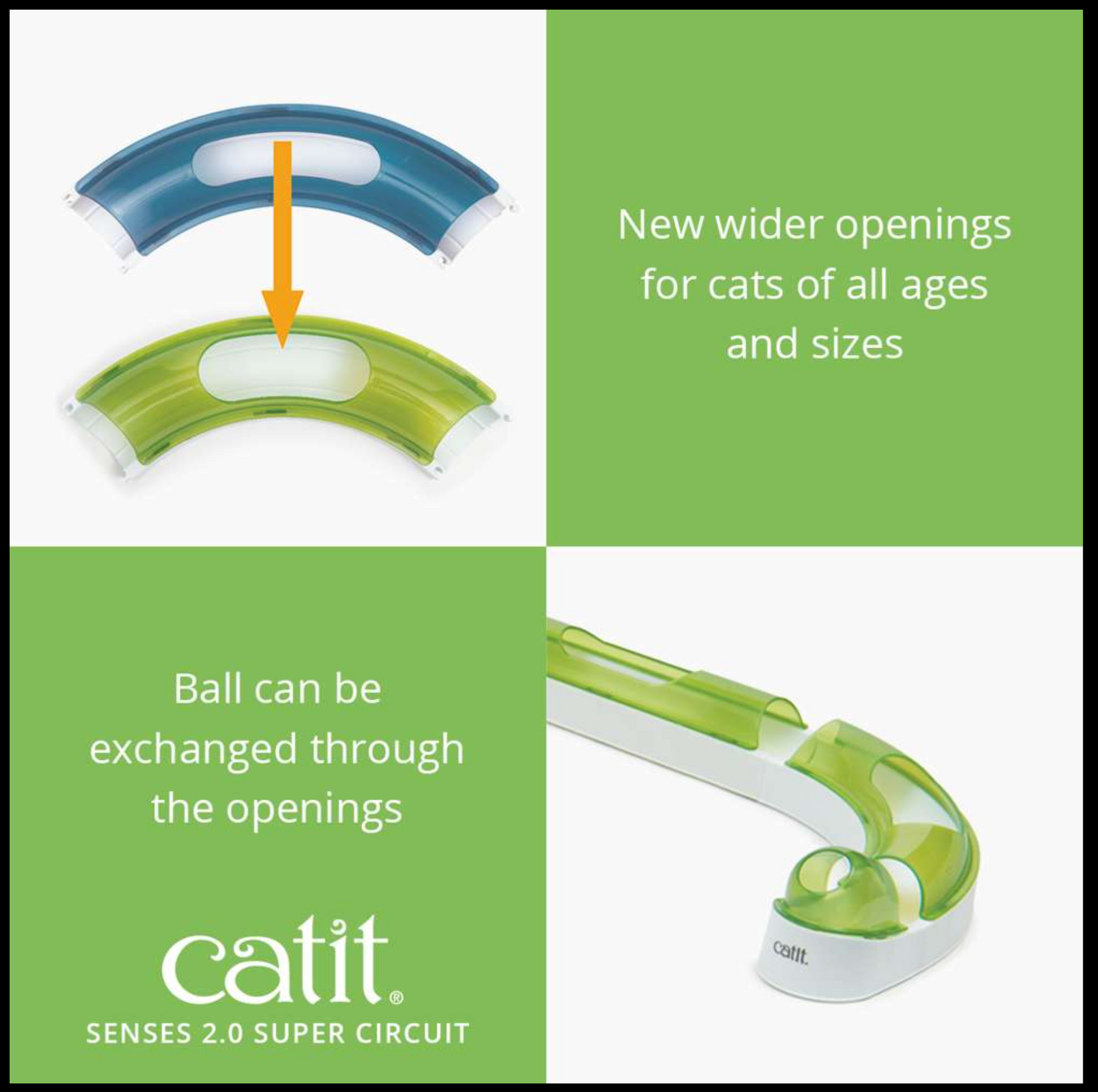 Circuit track with special peek-a-boo cover! Each circuit consists of a ball that zips around a closed track in rollercoaster fashion. The special peek-a-boo cover stimulates cats to chase and swat the ball, which quickly adds up to hours of entertainment! 100+ layouts! To keep your cat interested, change their roy set-up often. The circuit can be built and rebuilt into different shapes around the house. Surprise your cat with a new layout every few days to keep the experience fresh and exciting!
