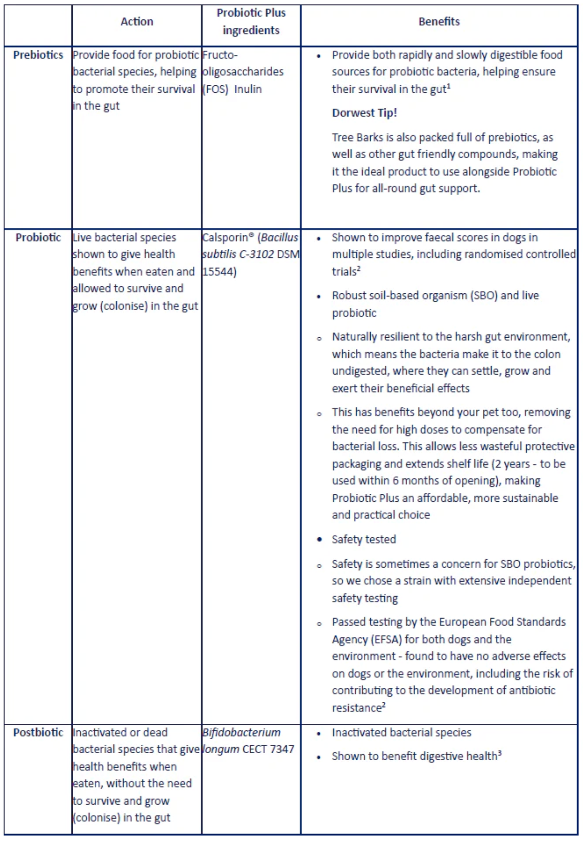 There is also ever-expanding research showing the importance of a healthy gut microbiome, i.e. all the microorganisms (including bacteria) that live in the gastrointestinal tract, for general health.⁴-⁶ This includes skin and even behavioural effects. Probiotics support the good bacteria in your dog's digestive tract and reduce the bad. Dorwest Probiotic Plus includes the probiotic Calsporin®, a robust soil-based organism (SBO) which has been tested for safety and efficacy, and has been proven to improve stool consistency.²