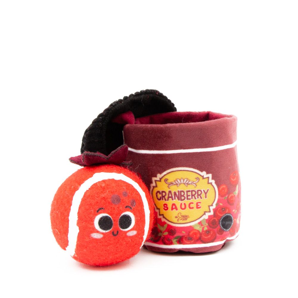 Festive, crinkly, cranberry sauce jar dog toy, with tennis ball inside for extra fun!