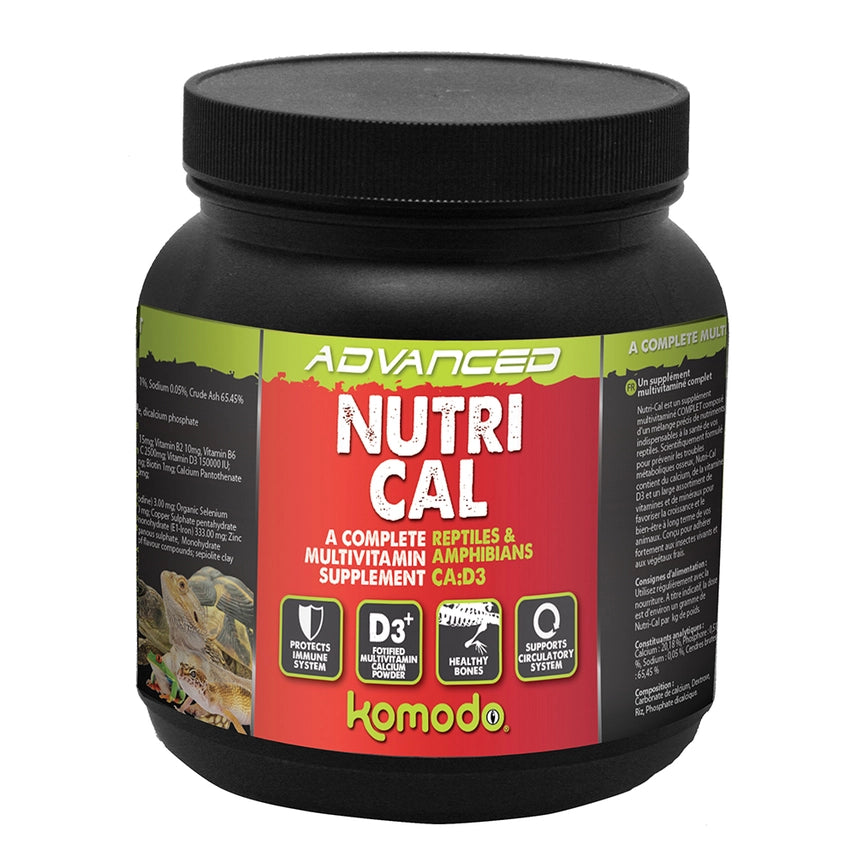 The Komodo Nutri-Cal is a complete multivitamin, packed with a precise balance of key nutrients essential for reptile health. It has been scientifically formulated to aid in the prevention of metabolic bone disease. Nutri-Cal contains calcium, D3 and a broad complex of vitamins and minerals to support growth and long term well being. Nutri-Cal is an important tool in the feeding regime for the majority of tortoises and lizards. It is designed for maximum adherence to live insects and fresh plant food.