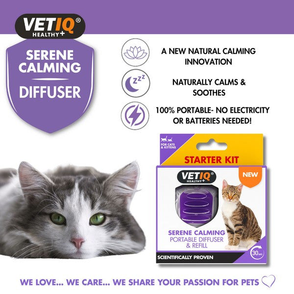 The VETIQ Serene Calming Portable Diffuser is a calming innovation for cats & kittens to help calm and relax your feline friends at home when they experience separation anxiety, anxiousness or hyperactivity, without the sedative effect.