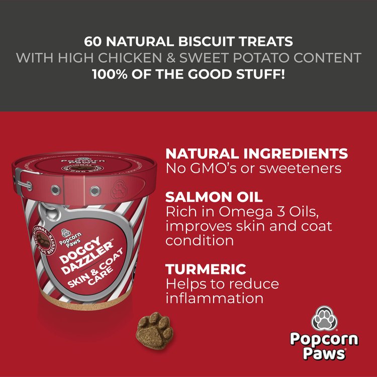 SKIN & COAT CARE - Say goodbye to itchy skin and dull coats with our high-protein skin and coat care treats enriched with omega-3 fatty acids, turmeric, and primrose oil for a glossy, sleek appearance.