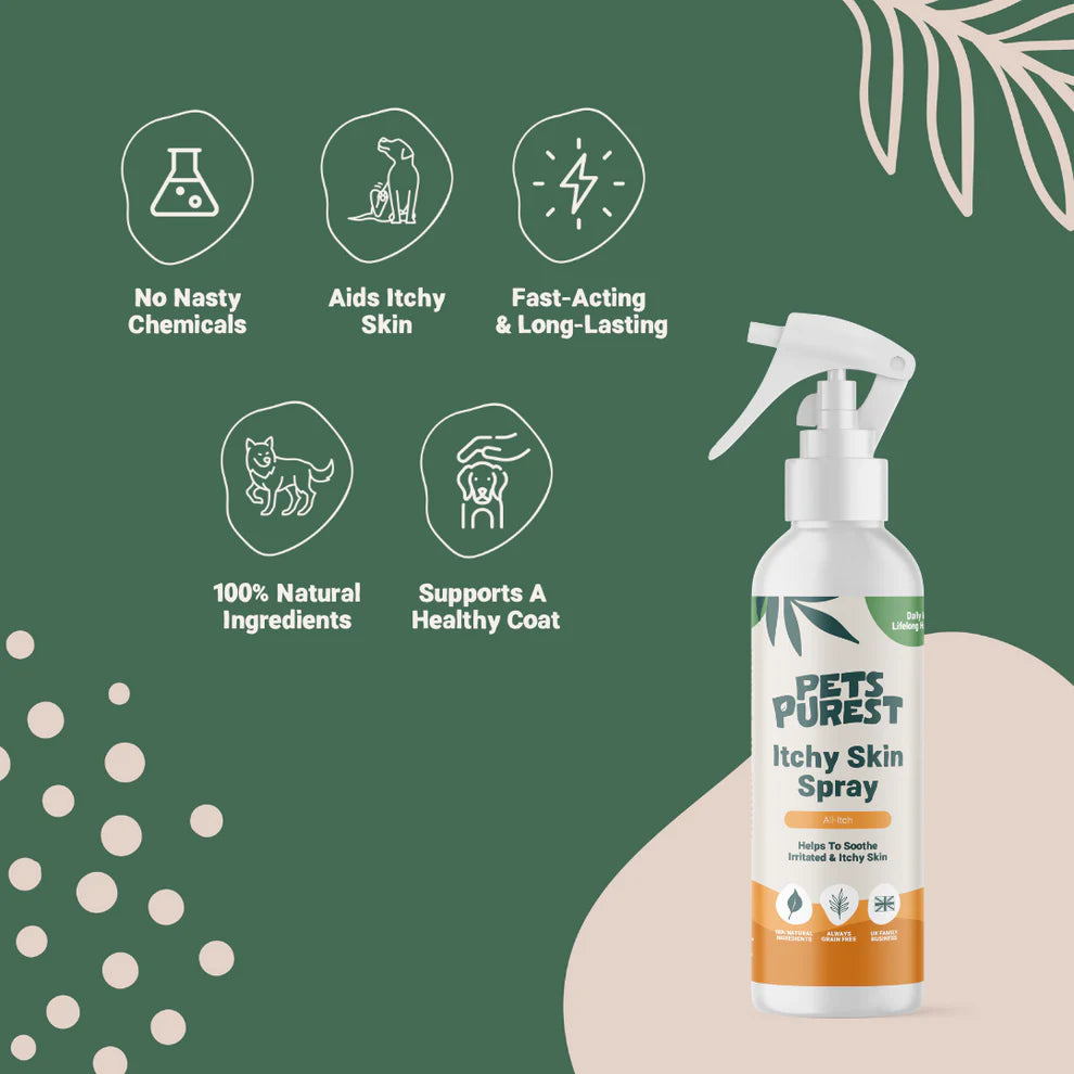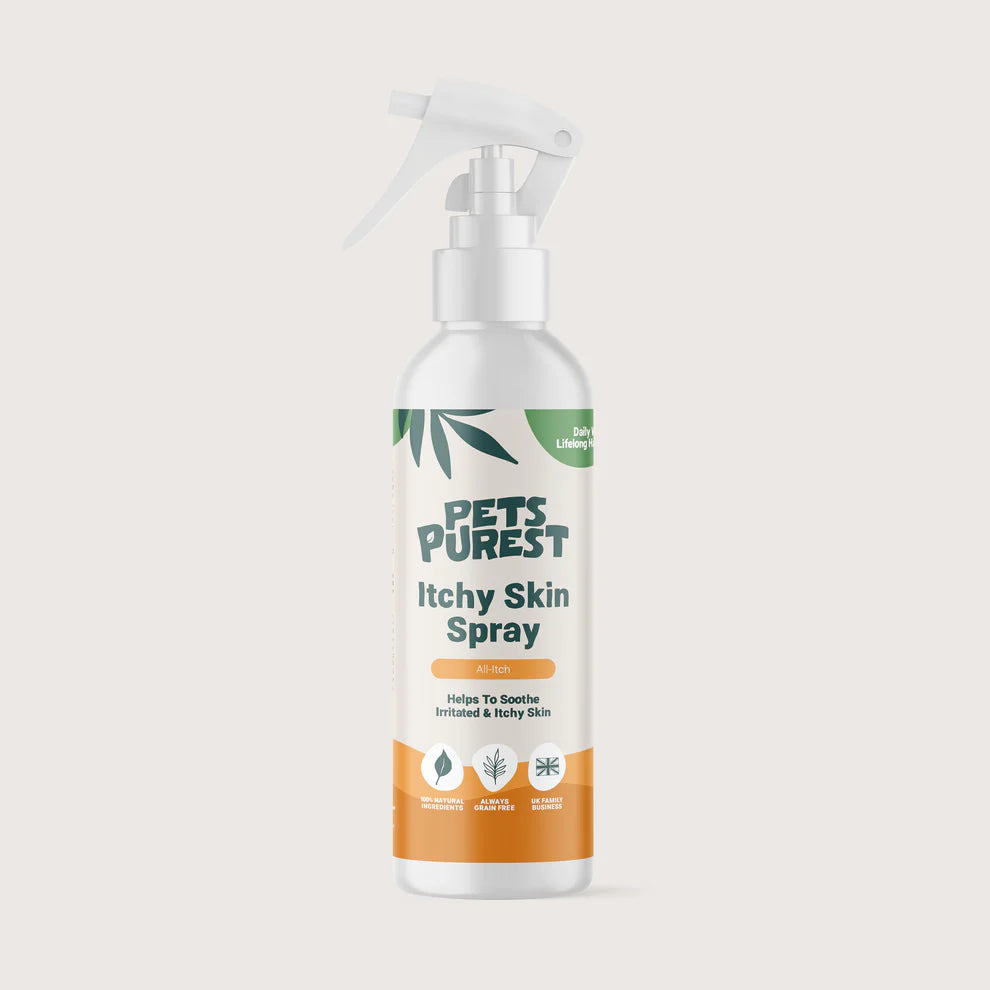 Pets Purest Natural Itchy Skin Spray helps to soothe irritated and itchy skin. The 100% natural formula also helps to keep skin clean and free from bacteria. Specially formulated for sensitive skin, with no harsh chemicals or fragrances, this spray is ideal for even the most sensitive pets.