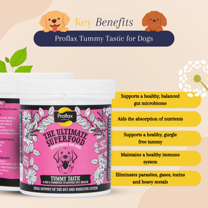 Proflax Tummy Tastic is a 100% natural, ready-blended concentrated herbal powder formula for dogs. It is specifically designed to support all aspects of digestive health including the pancreas. This fabulous herbal blend is the UK's No.1 comprehensive digestive support supplement for dogs!