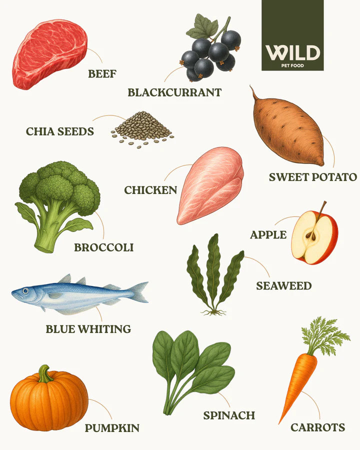 Cold-Pressed Sunflower Oil 3%, Carrot 3%, Sweet Potato 3%, Kelp Seaweed 2.5%, Spinach 2.5%, Ground Chia Seeds 2%, Pumpkin 1%, Apple 1%, Blackcurrant 1%, Herb, Botanicals & Superfood Blend 1% (Oregano 0.1%, Chicory Root 0.1%, Ginger 0.1%, Turmeric 0.1%, Black Pepper 0.1%, Echinacea Root 0.1%, Algae Omega 3 Powder 0.1%, Broccoli 0.1%, Green Lipped Mussel Powder 0.1%, Natural Probiotic (Gut Friendly Bacteria - Bacillus Velezensis) 0.0023%)
