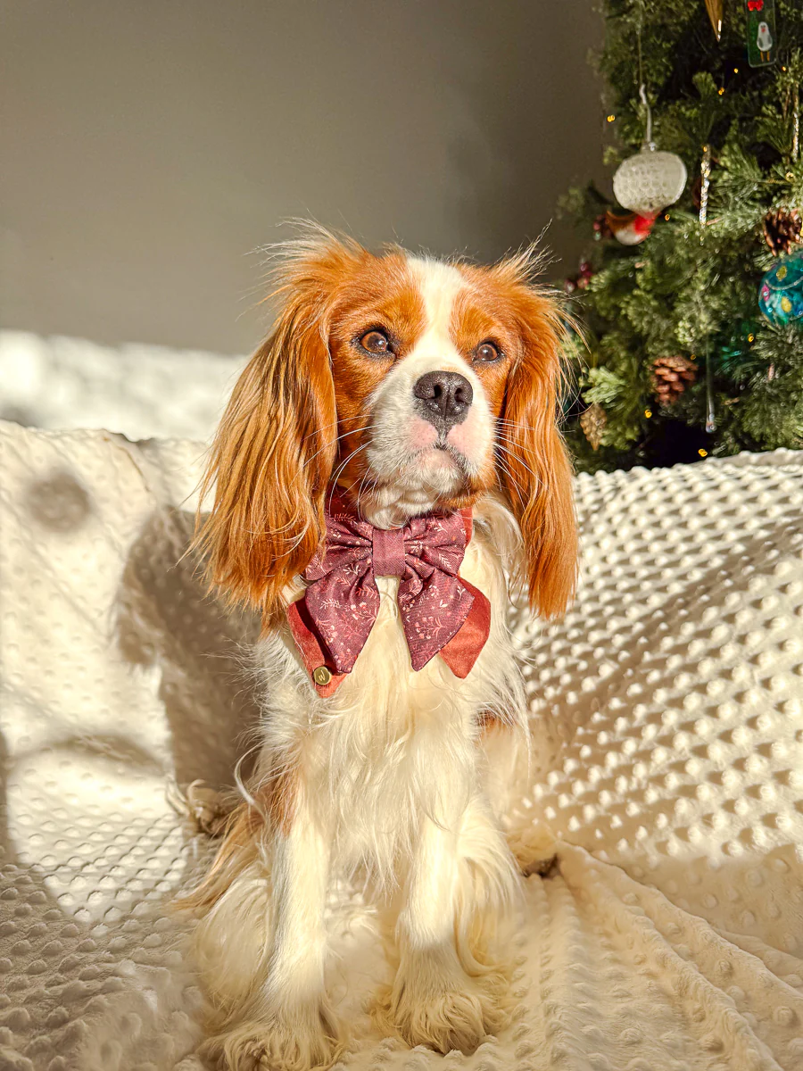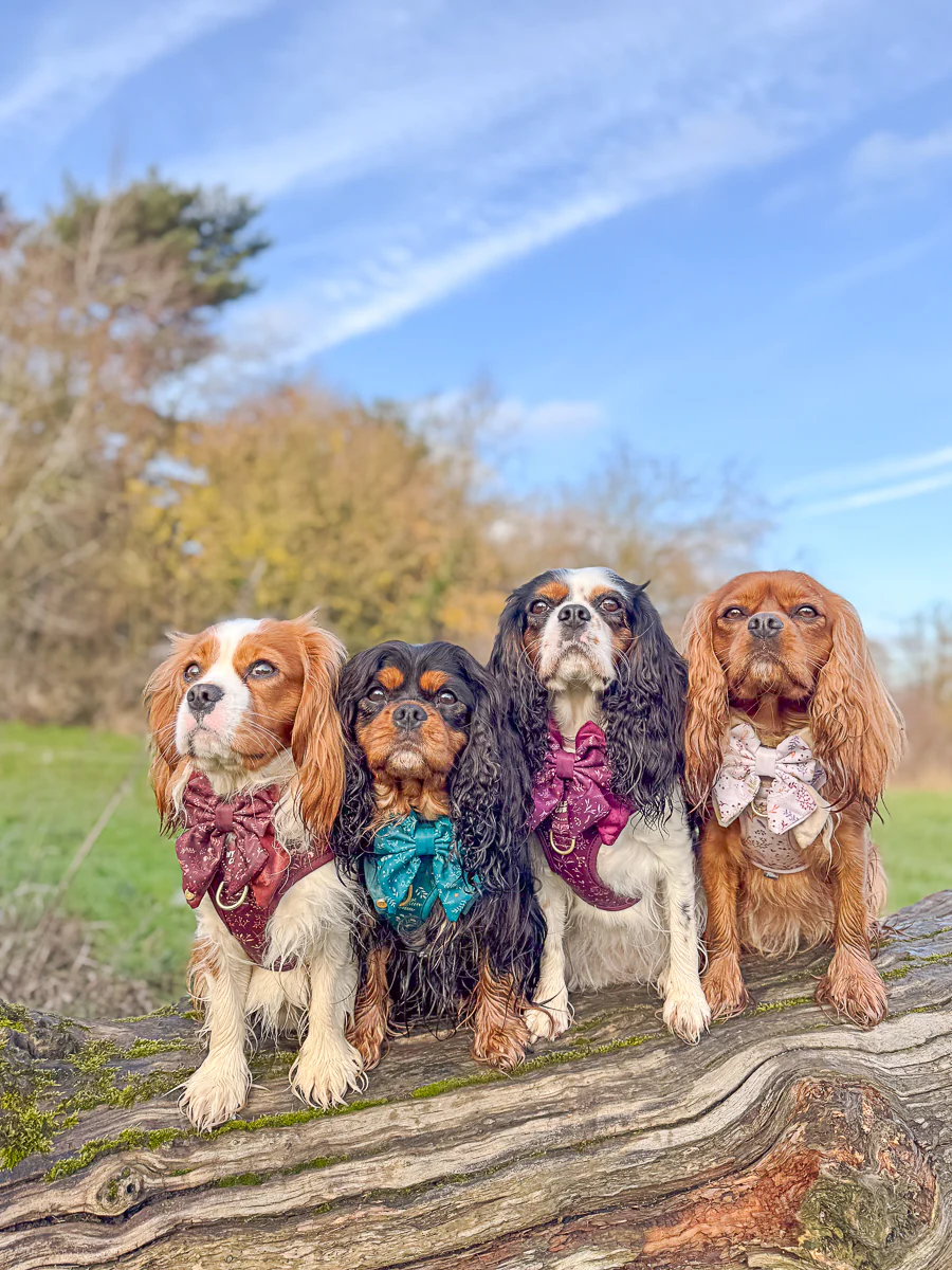 Elevate your dog’s style with our luxurious plush velvet and printed butterfly bow, designed to be worn on either a collar or a harness, the perfect luxe addition to our matching walk-wear collections. This bow tie is crafted from two sailor bows layered to create a stunning and refined butterfly shape. It is finished with a golden branded stud for that extra touch of elegance. The bow is secured with elastic straps to keep it in place, offering a snug and comfortable fit which ensures comfort for all skin and fur types. This is the ideal accessory to add sophistication and style to your pup’s walk-wear collection. Check out the matching collars and other Bow Ties available!