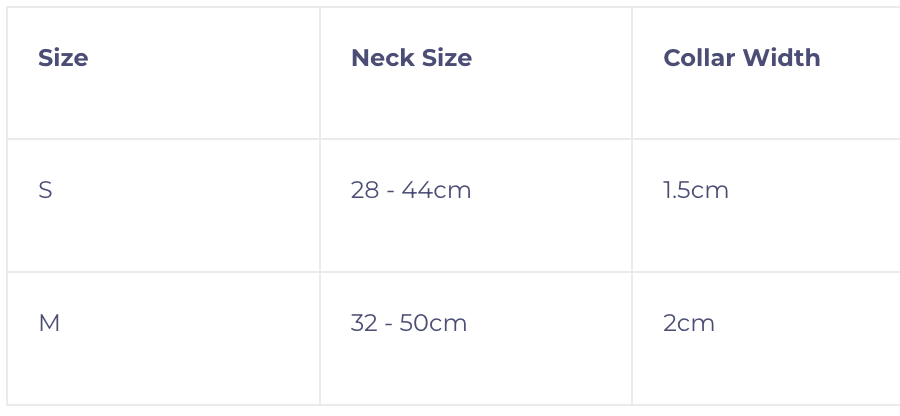 The Adjustable Dog Collar sizes are the minimum and maximum measurements that the product adjusts to. If your dog is in between measurements, we recommend ordering the next size up. Please read the Sizing & Fit Guide and measure your dog carefully before placing any order. The size chart is specific to this product only.
