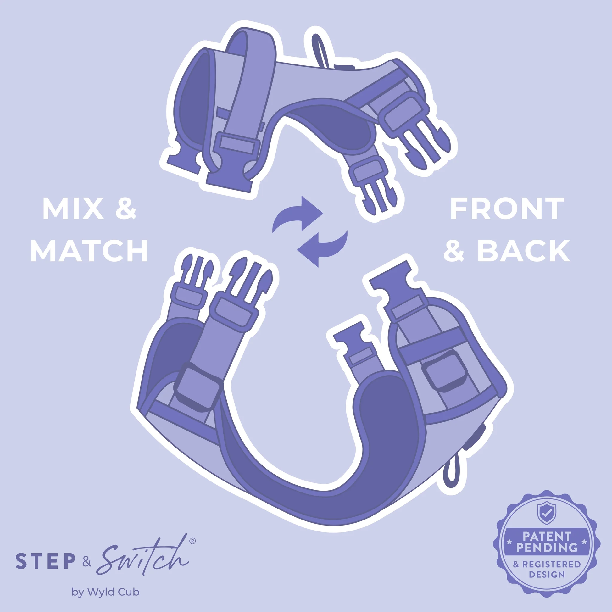 The Step & Switch® Harness is fully adjustable at the neck and chest. Leave a two-finger gap for a secure, comfy fit. If your dog is between sizes, we recommend choosing the next size up. Please read the Sizing & Fit Guide, and measure your dog carefully before placing any order. The size chart is specific to this product only.